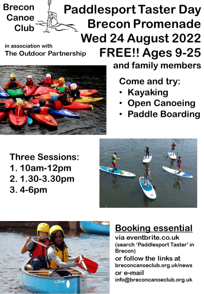 Brecon Canoe Club will be running an ‘open day’ on Wed 24 Aug where young people from our local community can come and ‘have a go’ at kayaking, open canoeing and paddle-boarding.